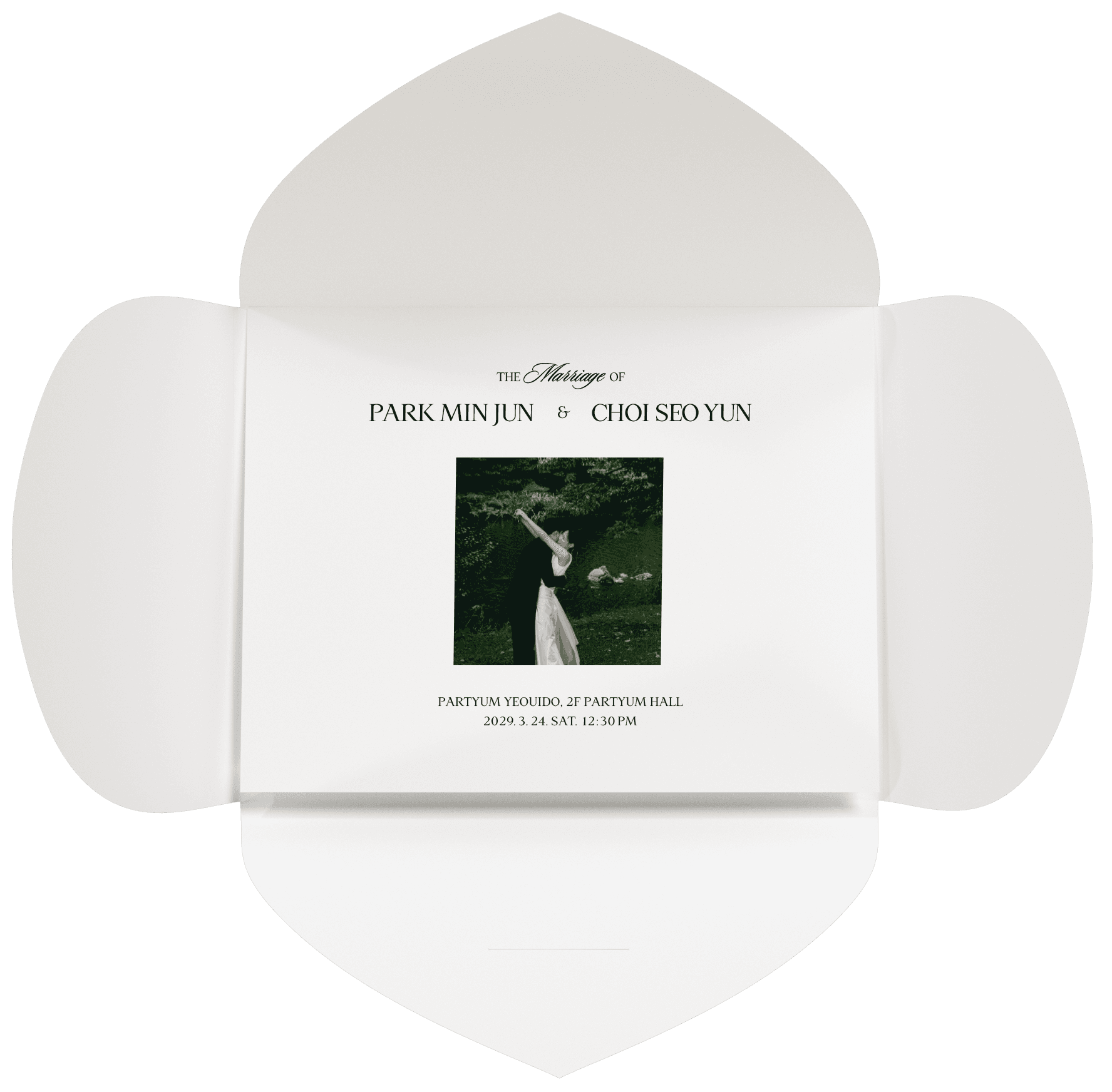 페탈 시리즈 <Fiore>는 꽃잎이 피어오르듯 펼쳐지는 사랑의 순간을 담았습니다. 하트의 형상을 해체하여 꽃으로 재구성한 디자인은, 두 사람의 사랑이 한 송이 꽃처럼 피어나는 모습을 상징합니다. 닫혀 있을 때는 은은하게 꽃의 실루엣이 드러나고, 실링 왁스를 떼어 열면 사방으로 꽃잎이 펼쳐지며 함께 피어나는 축복의 장면을 연상케 합니다. 따뜻한 웜화이트 톤의 실링 왁스와 봉투, 내지가 어우러져 하나의 꽃처럼 조화로운 웨딩 무드를 완성합니다.