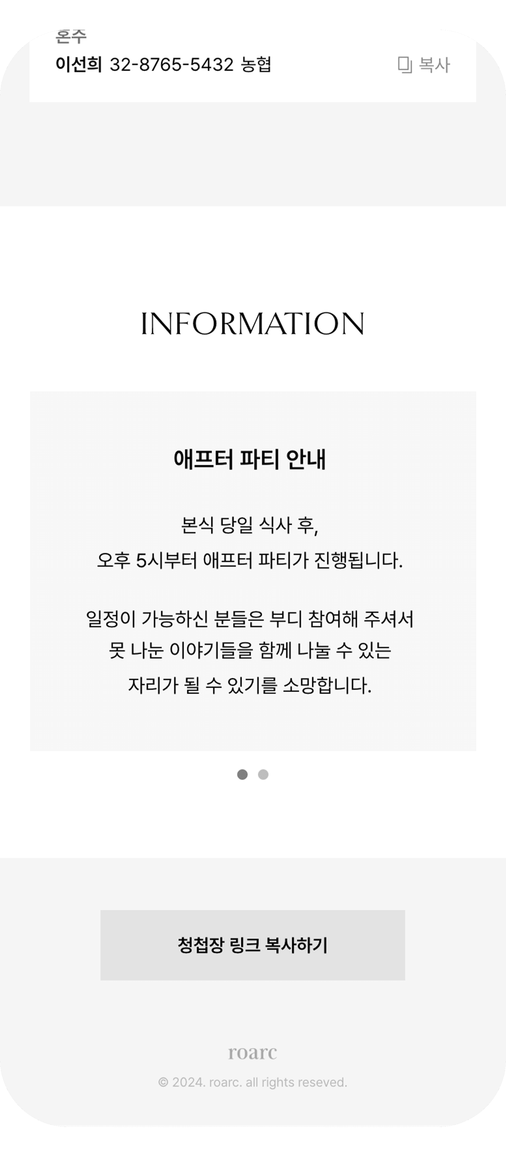 로아크의 모든 상품은 모바일 청첩장까지 통일된 완성형 디자인으로, 시각적 균형과 완성도를 위해 별도의 폰트 변경은 제공되지 않습니다.